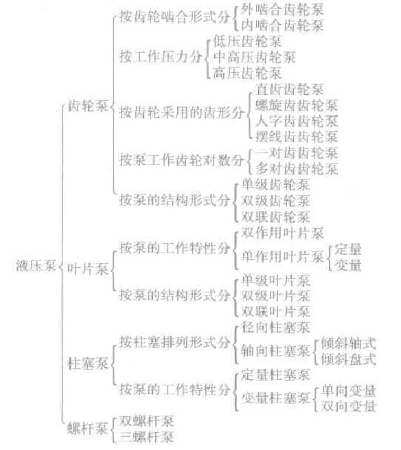泵的分類方式有多種按其結構不同,液壓泵可分為齒輪泵,葉片泵、柱塞泵和螺桿泉;按其壓力不同,又可分為低壓泵、中壓泵、中高壓泵、高壓泵和超高壓泵;按其輸出流量能否調節,又分為定量泵和變量泵。相信通過以下的圖解讓大家比較清晰地理解液壓泵的分類條件和類型,分類圖解圖如下: