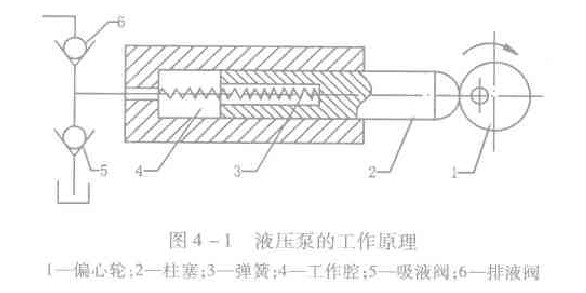 液壓泵的類型雖然不同,但它們的工作原理卻是相同的。現以單柱塞泵為例說明液壓泵的基本工作原理。如下圖所示,偏心輪1旋轉時,柱塞2在偏心輪和彈簧3的作用下在缸體內左右移動。柱塞2右移時,缸體中的密封工作腔4容積變大,產生真空,郵箱中的油液在大氣壓力的推動下打開吸液閥5進入工作腔4;柱塞左移時,缸孔中的工作腔變小,油液被強迫通過排液閥6進入系統中。當偏心輪連續旋轉時,便周而復始地重復上述過程。