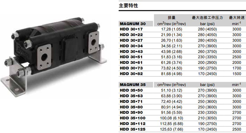 排量范圍:從17,28 cm3/rev (1.05 in3/rev) 到125,63 cm3/rev (7.66 in3/rev);分30, 35兩個規格